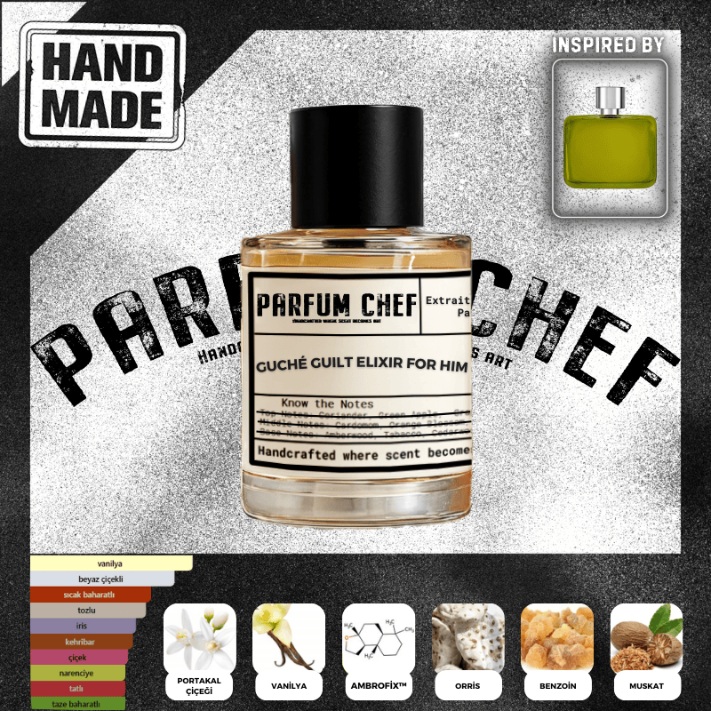 Erkekler için odunsu, amberli ve deri notaları içeren bir parfümdür.